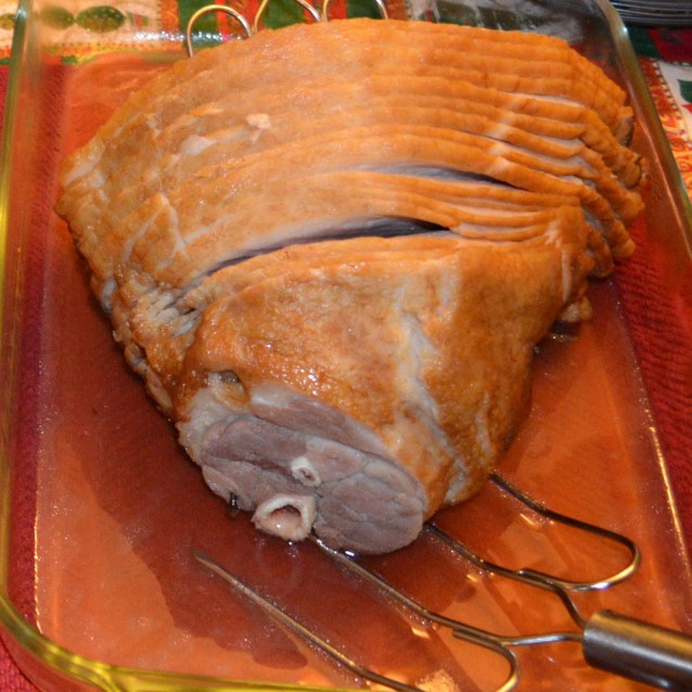 In my family, this ham is so good that it is staple not only at Easter, but also Christmas. As you can see of the little bit of the tablecloth, it was Christmas that this picture was taken. And the best part of this dish is that when you have gobbled up all of the ham, that bone makes a FANTASTIC broth for Split Pea Soup. Happy Holidays everyone!