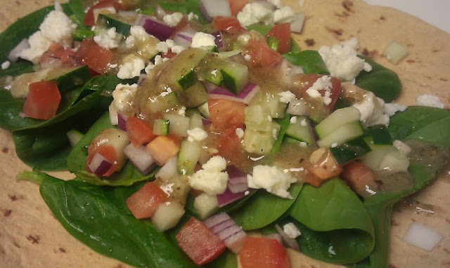 This doesn’t need a lot of instructions with it. Dice all of the tomatoes, onion & cucumber and store in container together. Wash spinach well. Both of those steps done in the morning. At lunch, assemble sandwich, lay spinach in the middle of the wrap. Top with veggies, feta cheese & Greek dressing and wrap the sandwich up.