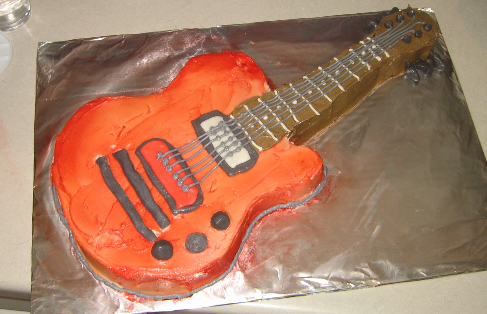 This cake can be made in a 9 x 13 cake pan or 2 – 8 inch or 9 inch rounds and will all turn out awesome! As I have been informed, it’s so good, people will be licking the plate clean when all the cake is gone! As for the shape, I found a print out online for a guitar and used it as a format for the shape that I wanted. Easy as pie…I mean cake!