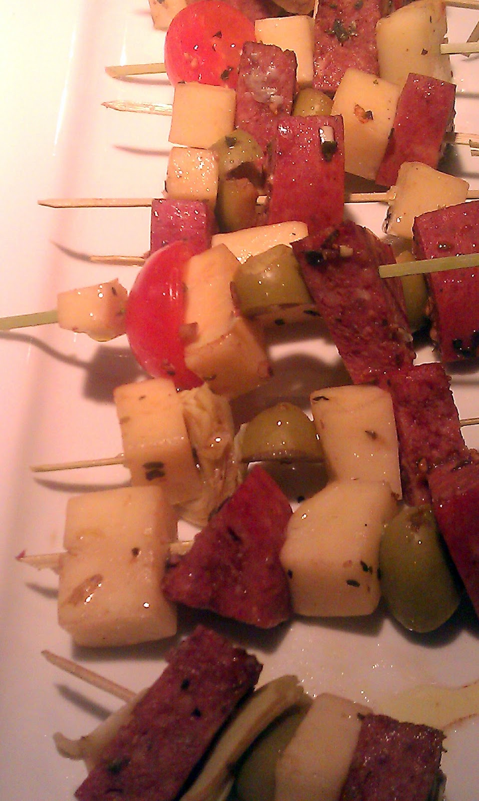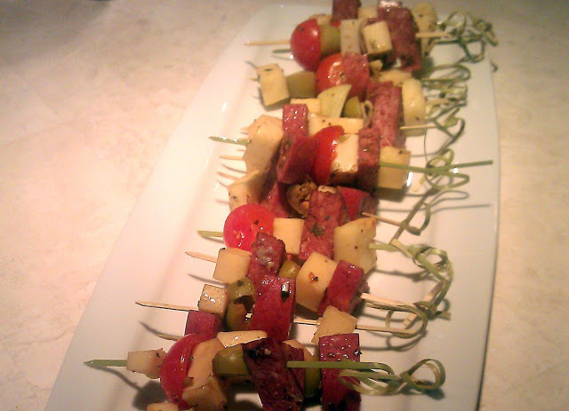 Notes: You can make the vinaigrette a day ahead of time and keep chilled in the fridge. I also served this minus the mini skewers for a get together at my home. Left everything in a nice large bowl…and believe me, that bowl was empty by the end of the party.