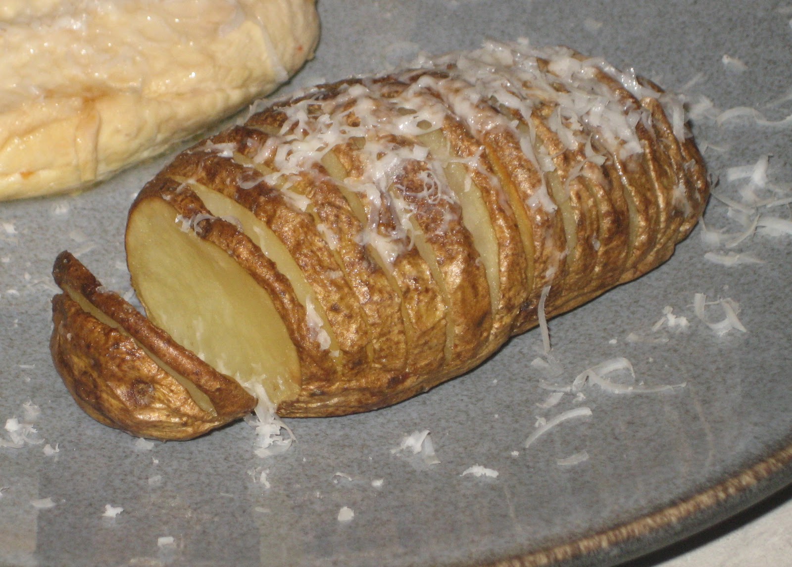 I started this dish with four potatoes and I ended with two that were photograph-able at the end because I was a little heavy handed with the knife. Two of the potatoes became four when I didn’t stop and went through to the bottom. Oops! No worries…they were still edible, but not the best for the blog.