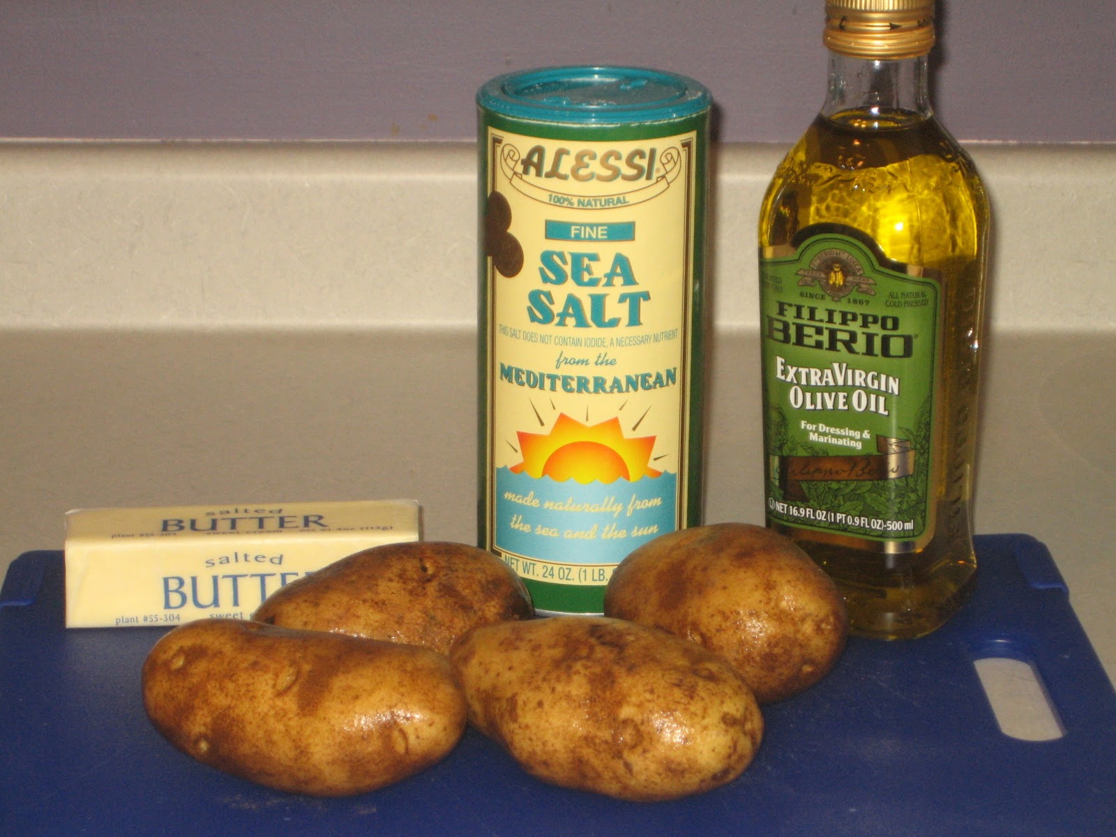 - Slip slices of butter in between a few of the cuts in the potatoes. Drizzle a little olive oil the top of the open potatoes and top with sea salt.