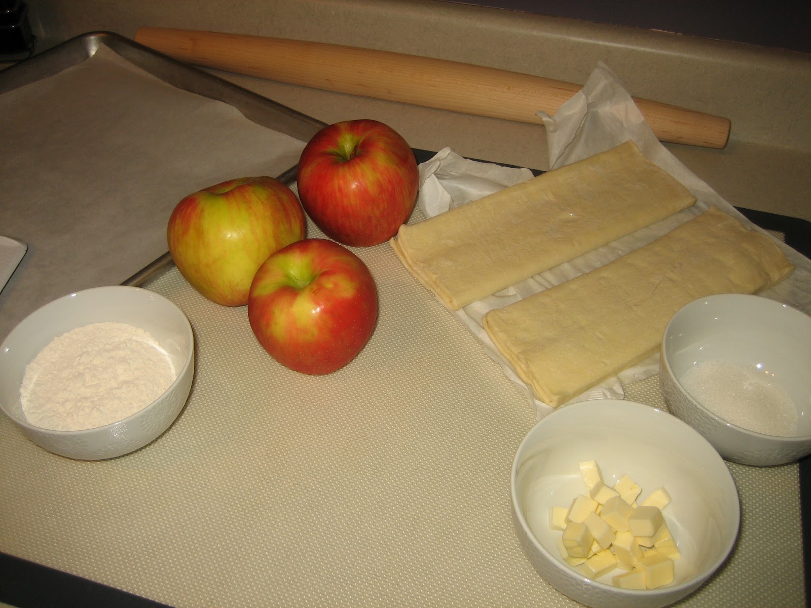The main tip with this dish is to have everything ready for your apples. Pre-cut the butter & store in the fridge, roll out the pastry dough and place it on the sheet pan, preheat the oven and get your station ready.