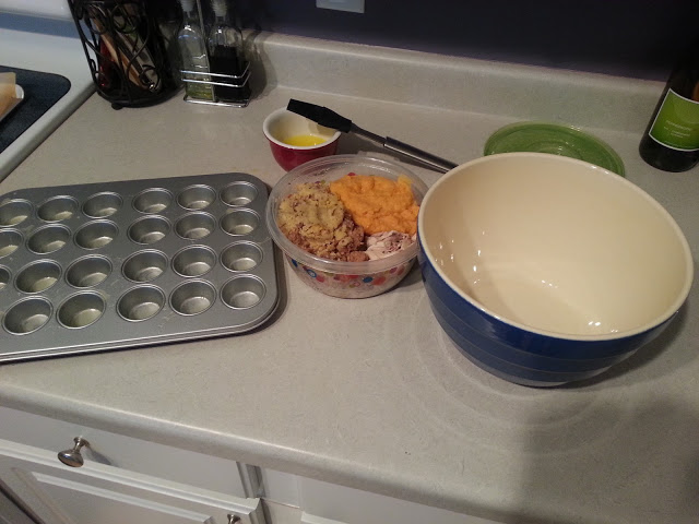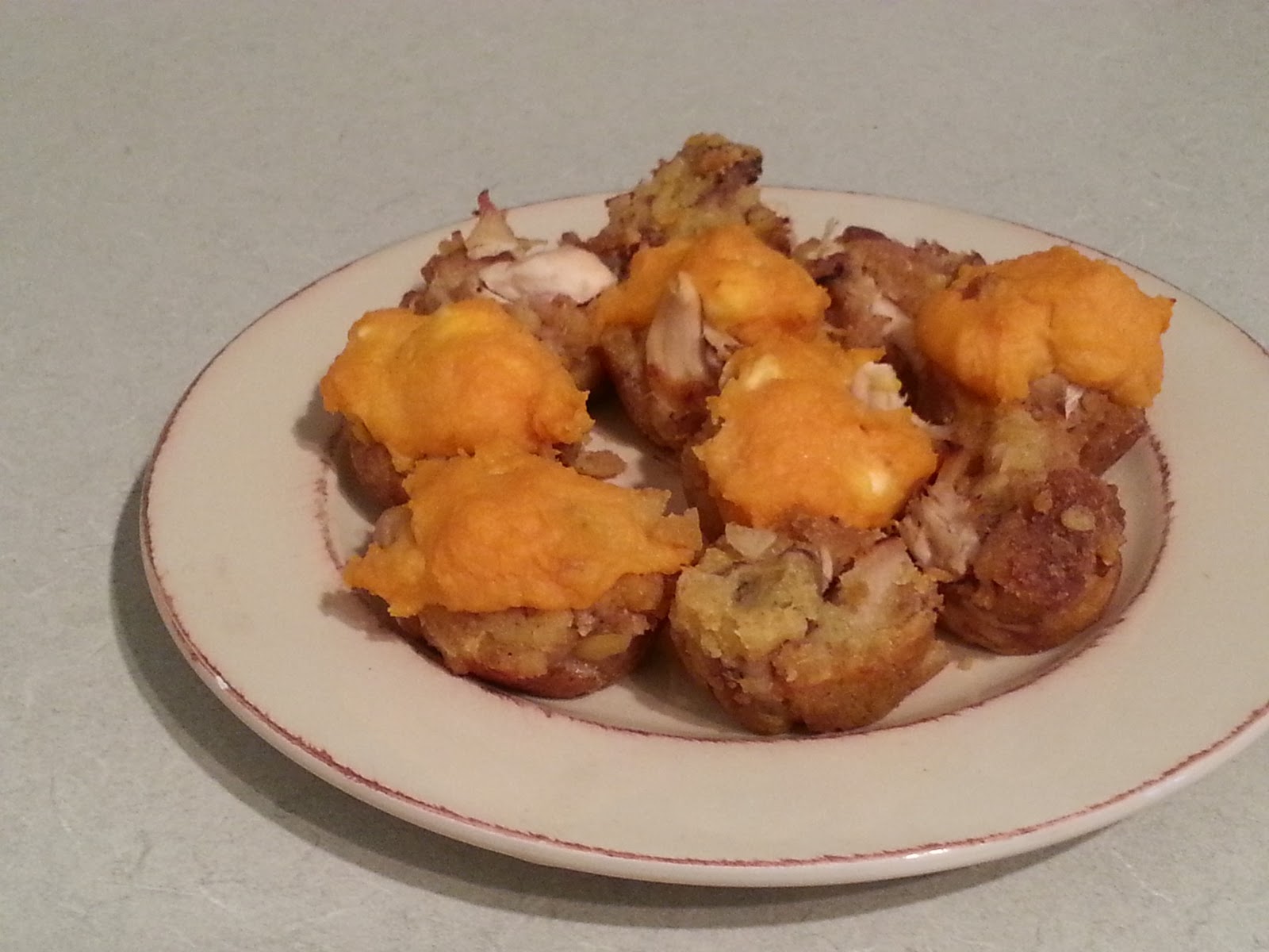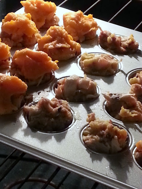 - Fill the mini muffin cups with the mixture and top with mashed sweet potatoes.