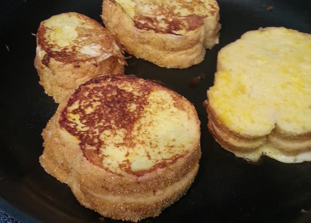 - One at a time, submerge your stuffed french toast sandwiches in the egg mixture and place in pan. You can put up to 3-4 pieces of toast in the pan, depending on the size, but make sure that they aren’t touching.