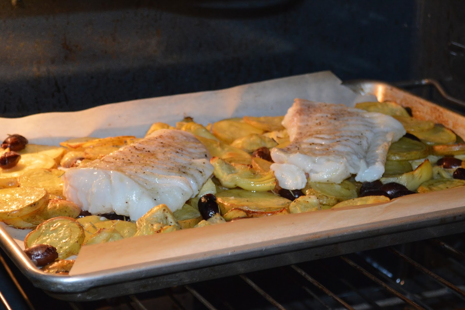 - Brush the fish with olive oil and season with salt and pepper. Place on top of the vegetables and return to oven to bake until fish is opaque and vegetables golden brown. Approximately another 10-15 minutes.