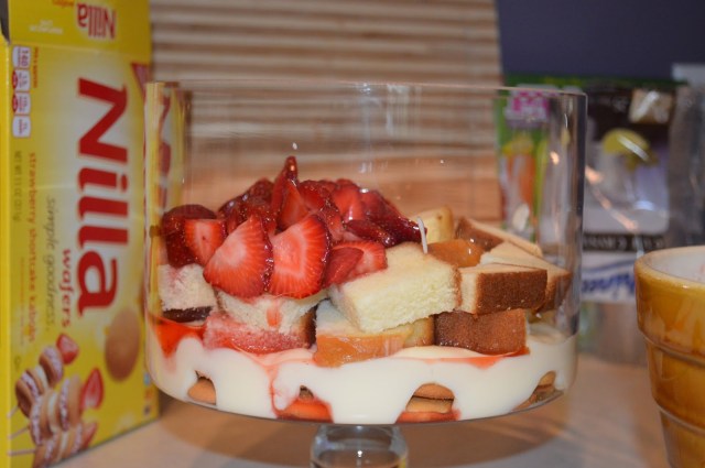 - Constructing the Trifle – Layer the following (try to get 3 layers, but if not, 2 will do): Nilla wafers, custard, short bread, strawberries (don’t forget some of the juice), whipped cream; and repeat.