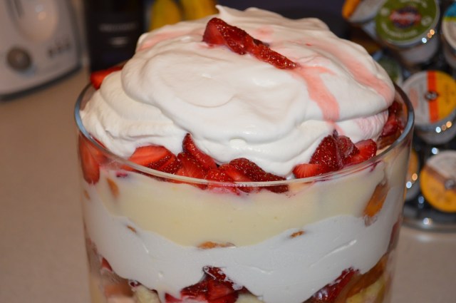 I think that the best thing about this dessert is that we got to purchase a trifle dish to have the right presentation on this dish. With how much I have cooked and grilled and made desserts and baked – I didn’t have a trifle dish. Now that I think about it, there are a few misc kitchen items I don’t have – like a bundt pan or a punch bowl. I’m sure some day I’ll find a recipe that I want to try which requires one of those items.
