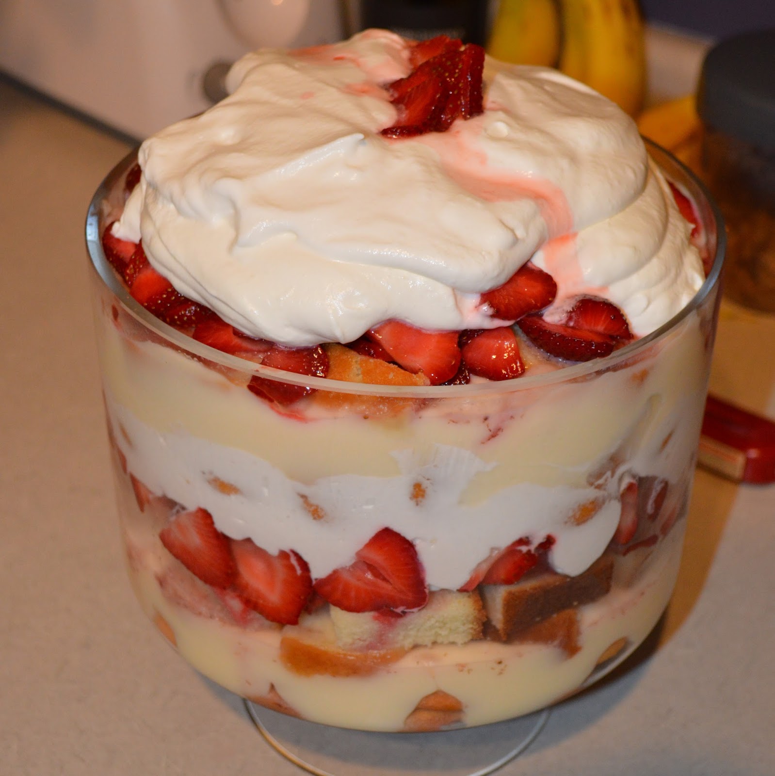 - Constructing the Trifle – Layer the following (try to get 3 layers, but if not, 2 will do): Nilla wafers, custard, short bread, strawberries (don’t forget some of the juice), whipped cream; and repeat.