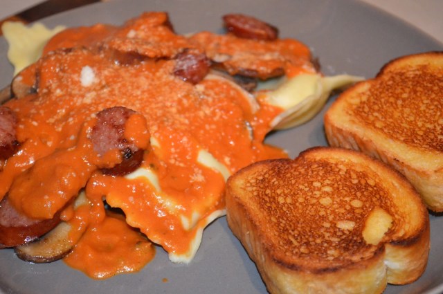 Sauteed Mushrooms & Kielbasa with Ravioli