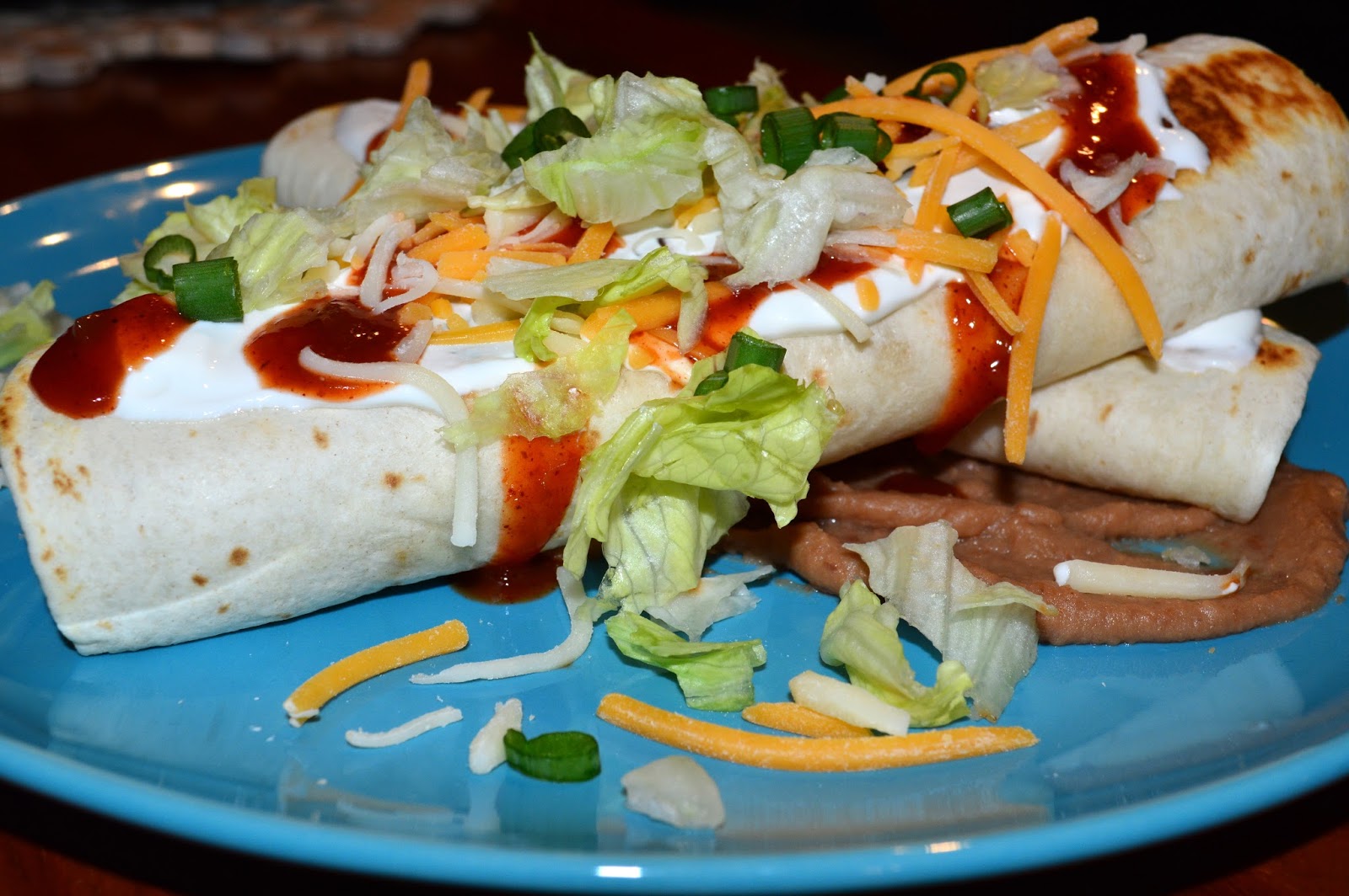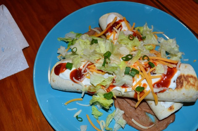 SOOOO good! Like the perfect combo taco, burrito, chimichanga…this dinner was super tasty! My favorite part is everything that you can put on top of these crunchy, creamy dinner delights. More cheese, more salsa, lettuce, refried beans, hot sauce. Yum! Yum!