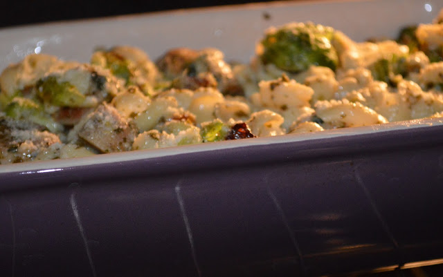 - When pasta is done, start pulling it from the water and strain into a bowl. Add chicken, Brussels sprouts and pesto sauce. Stir them together and place in baking dish. Top with Parmesan and put in the oven until serving time.
