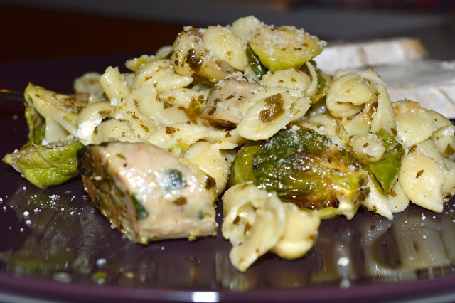 The combination of the freshness of the pesto, the comfort of the pasta, the earthiness of the Brussels Sprouts and the texture and slight spice of the chicken sausage came together for a wonderful weeknight dinner.