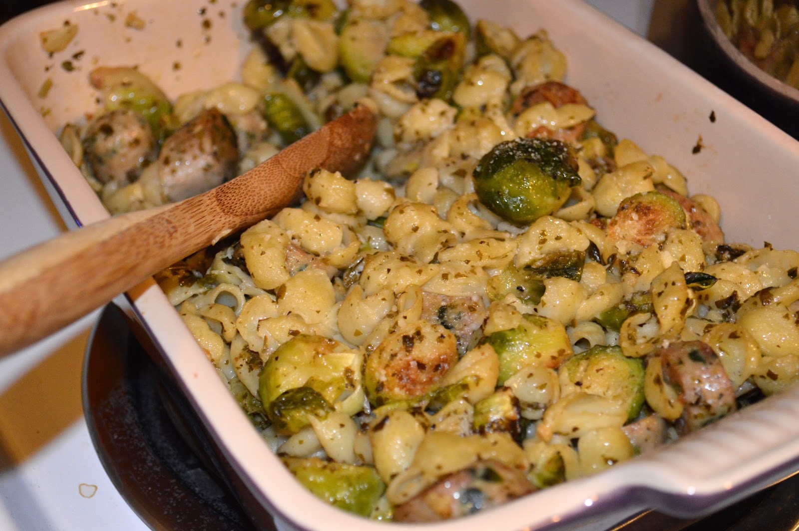 The combination of the freshness of the pesto, the comfort of the pasta, the earthiness of the Brussels Sprouts and the texture and slight spice of the chicken sausage came together for a wonderful weeknight dinner.