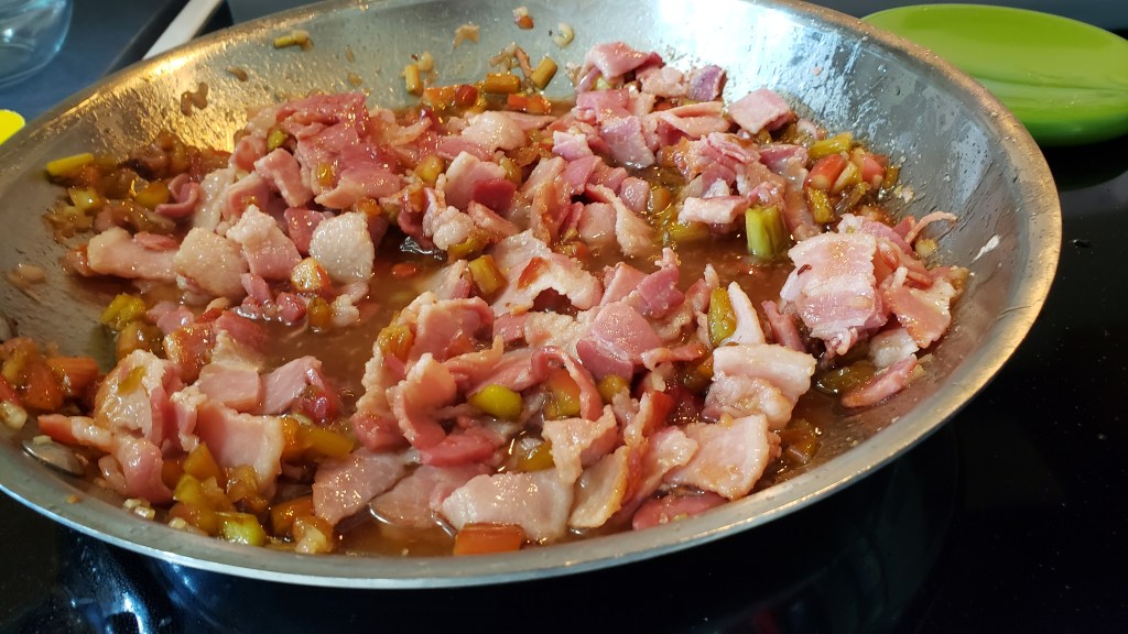 Heat skillet on stove to medium-high heat. Cut bacon into about 1″ thick pieces (you can go smaller if you want smaller bites). When pan is to temp, add bacon. Cook for about 6 minutes until starting to crisp up.