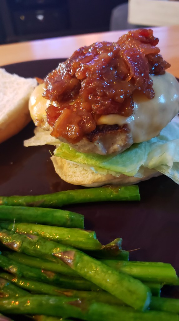 Assemble burgers with lettuce, condiment of choice and of course – the Bacon Rhubarb Jam. Grilling the bun and is a nice texture addition.