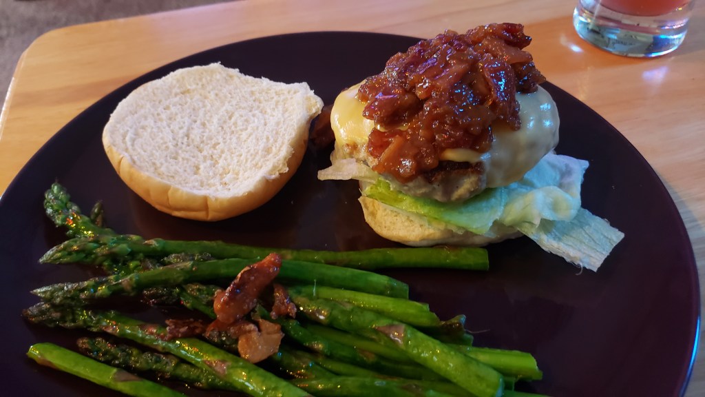 The turkey burger here was actually the burger on the second night. The first night was my standard seasoned grilled cheeseburger, which is a staple in our house during the summer or whenever there isn’t too much snow where the grill can come out. Really do not know why I didn’t take any pictures to share. So, next time we make those, I’ll have to share my special seasoning blend.