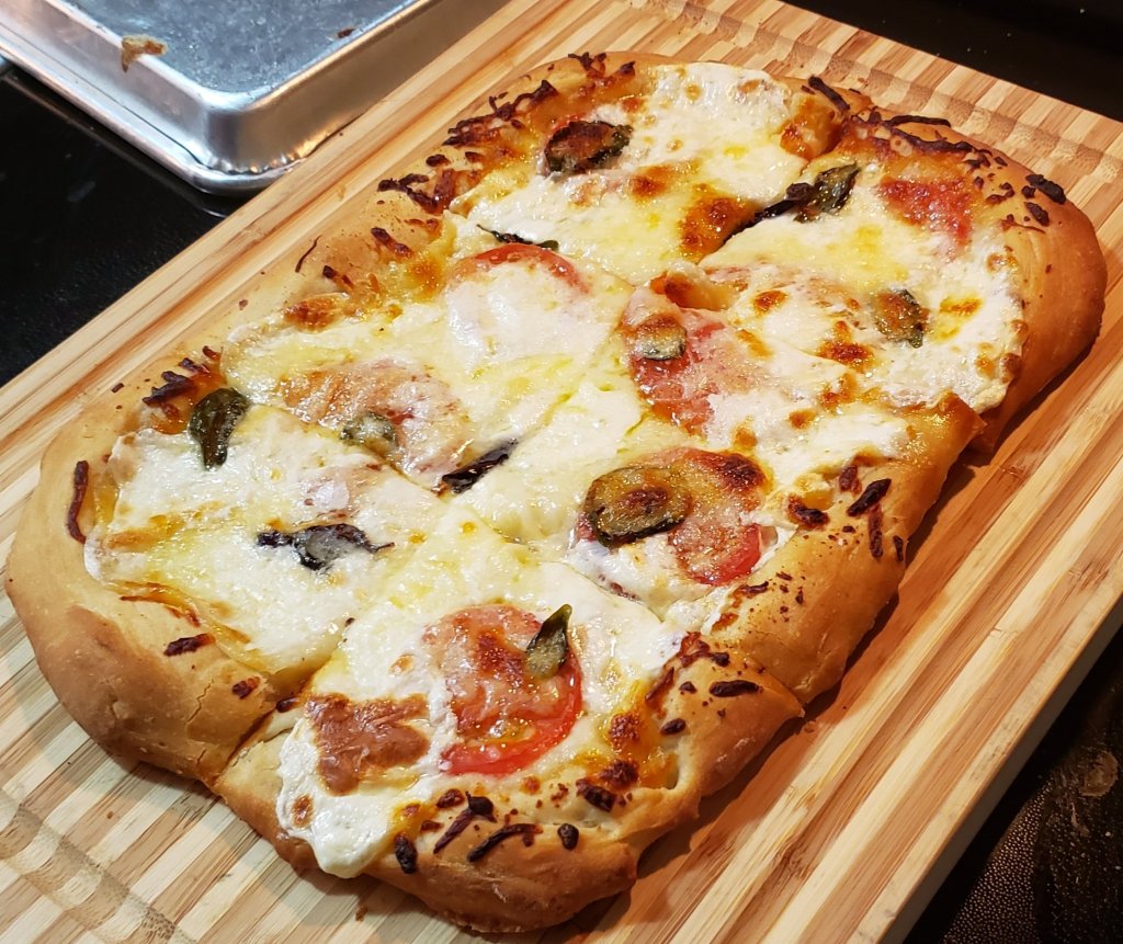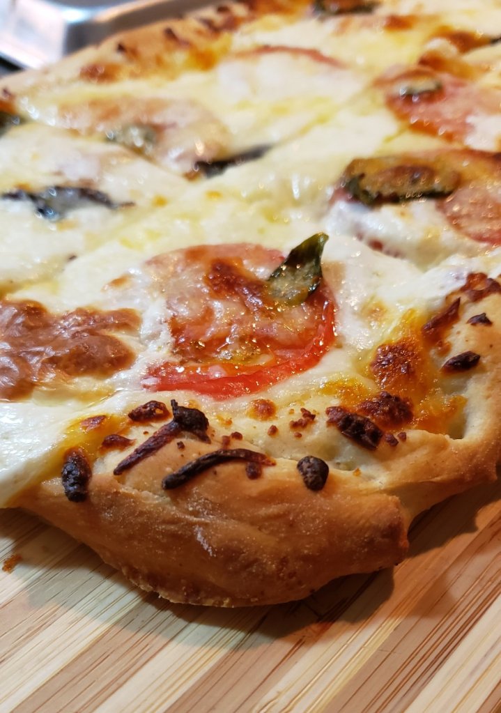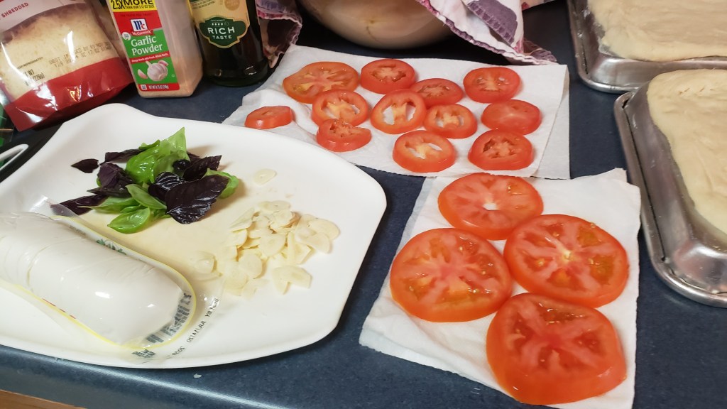 As with any pizza, everyone has a different definition for a ‘done’ pizza. I like my cheese browning and bubbly, where the teen, just likes hers cooked with very little brown on the cheese. The night of Margarita pizzas was also her night of straight up Cheese Pizza. It had the same crust and prep of the dough, just multiple white cheeses and when it came out, she did her own experimenting. Melted butter with garlic powder mixed in and brushed around the crust and over the top of her pizza. She was very satisfied with how it turned out, as was Eric and I. Pizza night success!