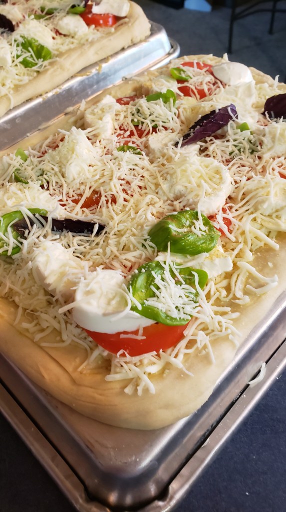 After pulling out the dough by hand and forming it, drizzled some extra virgin olive oil on top for the base. No sauce needed for this – keeping it simple.