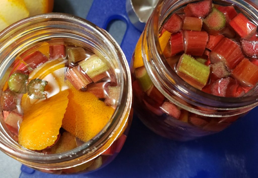 Clean and dice rhubarb into equal sizes and peel 6 large strips of orange peel. Place all contents in sealable container, seal and shake contents, and store in a dark cool place. If using 2 containers, split ingredients equally.