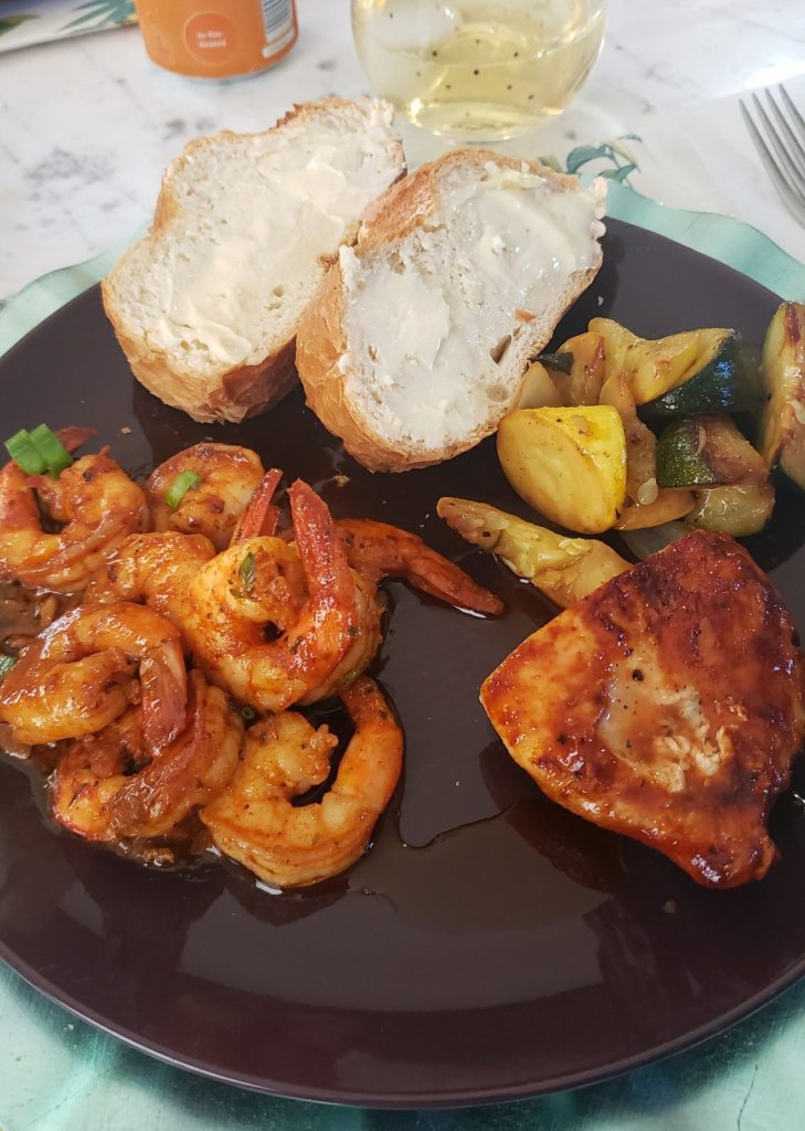 Above you can see the shrimp was served with BBQ grilled chicken breast, sautéed zucchini and yellow squash, and buttered bread. Don’t forget the side of wine. Great dish I will be making again.