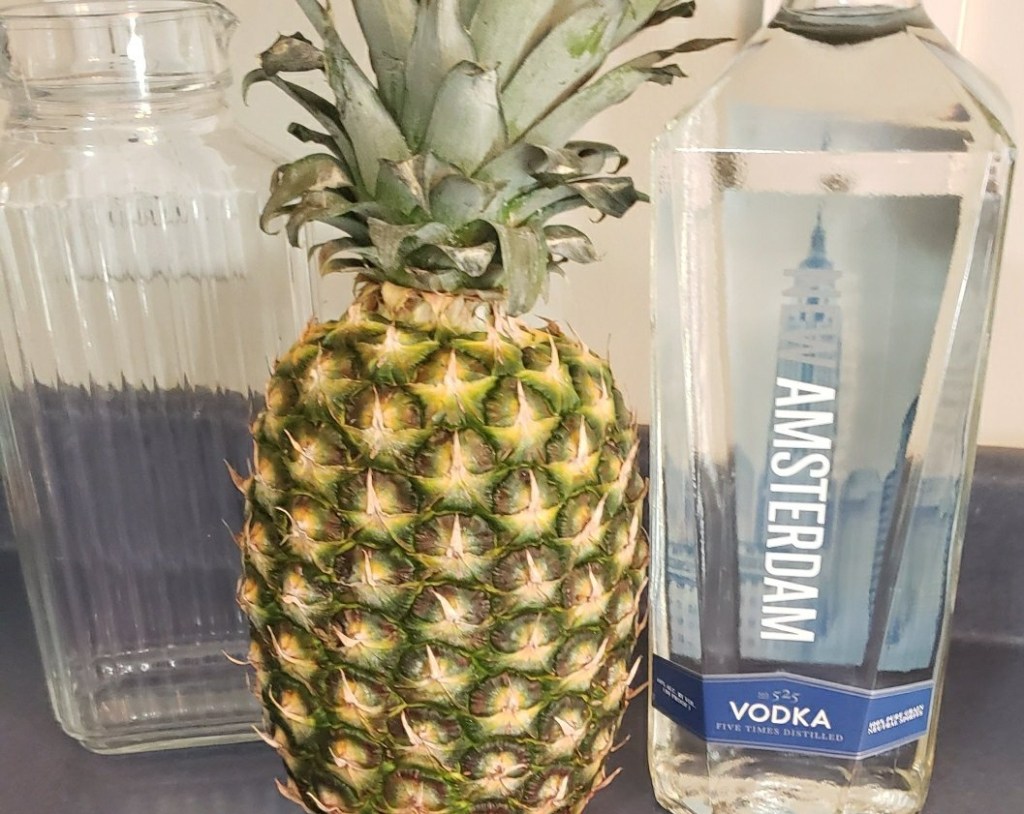 Peel and core the pineapple. Cut into chunks and place them in the pitcher. Pour in vodka until up to top. Let rest on your counter for 2 weeks.