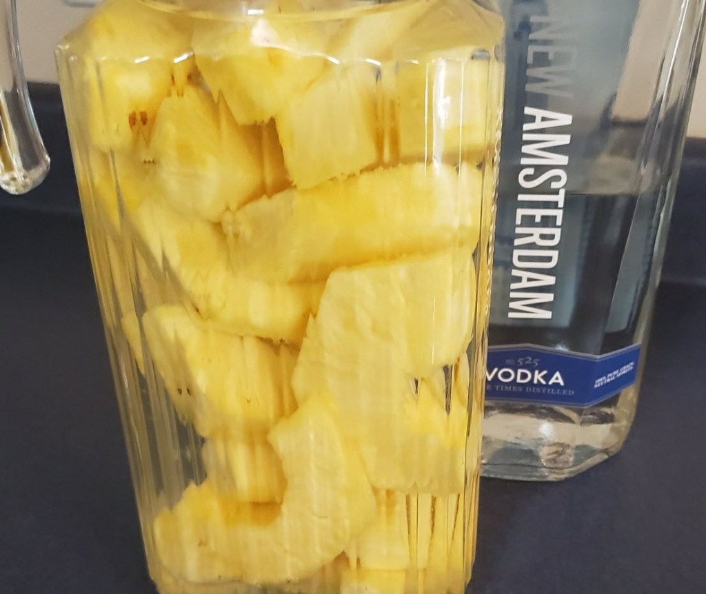 This is not a difficult recipe – peel and core a pineapple and let it sit in vodka for 2 weeks on the counter. After 2 weeks had passed, I tasted and it is yummy, but quite potent. I have been experimenting with modifications and cocktails.