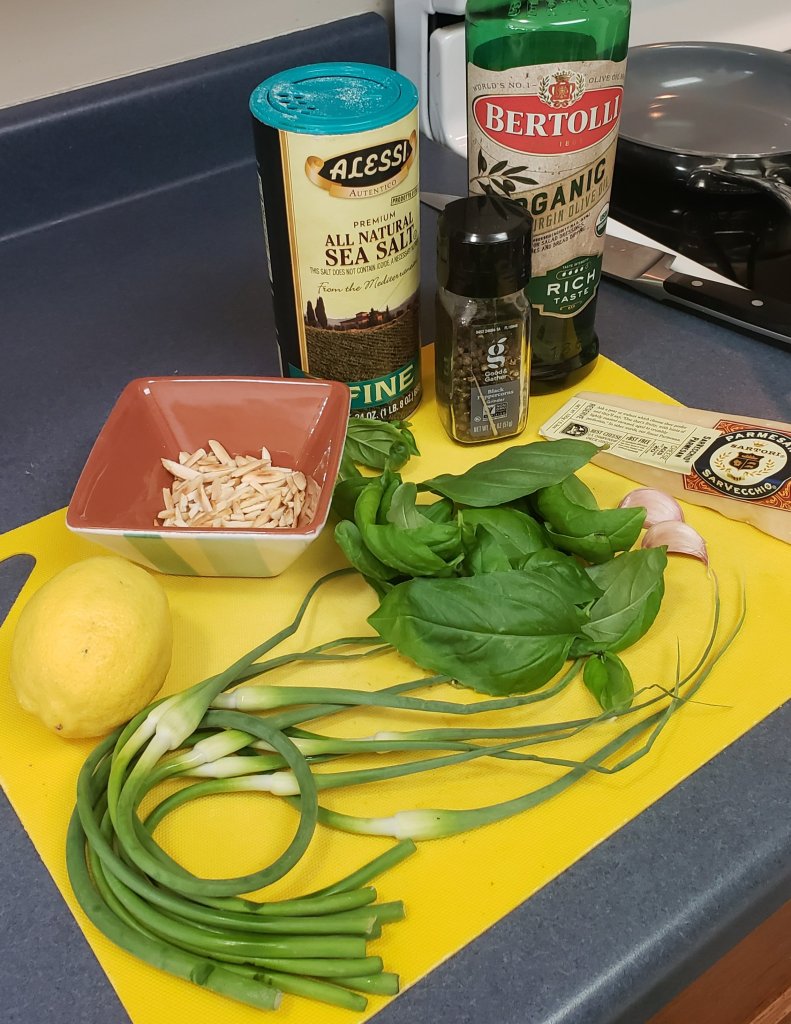 Garlic scapes are very seasonal in the Midwest – found at the beginning of the growing season only. They grow out of heads of garlic in the ground and if left to grow, will eventually flower. Garlic scapes taste a bit between a garlic clove and a shallot and can be used in the same manner as both – to add flavor to dishes, grilled by themselves to be a side dish, and in this case, made into a pesto for pasta night.