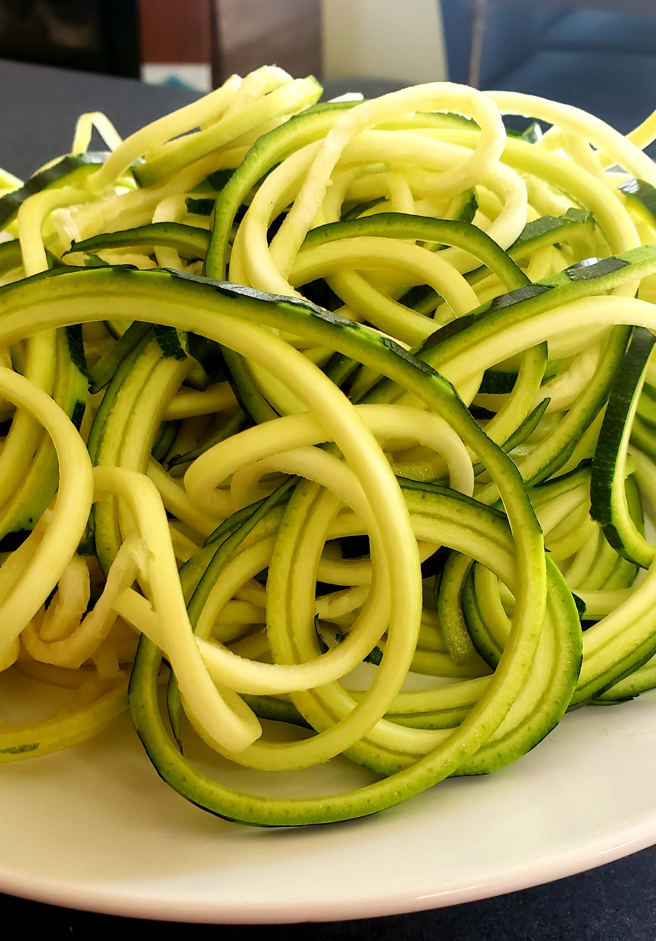 - Spiralize the zucchini, cutting the zucchini to a manageable eating length as it is spirilized.