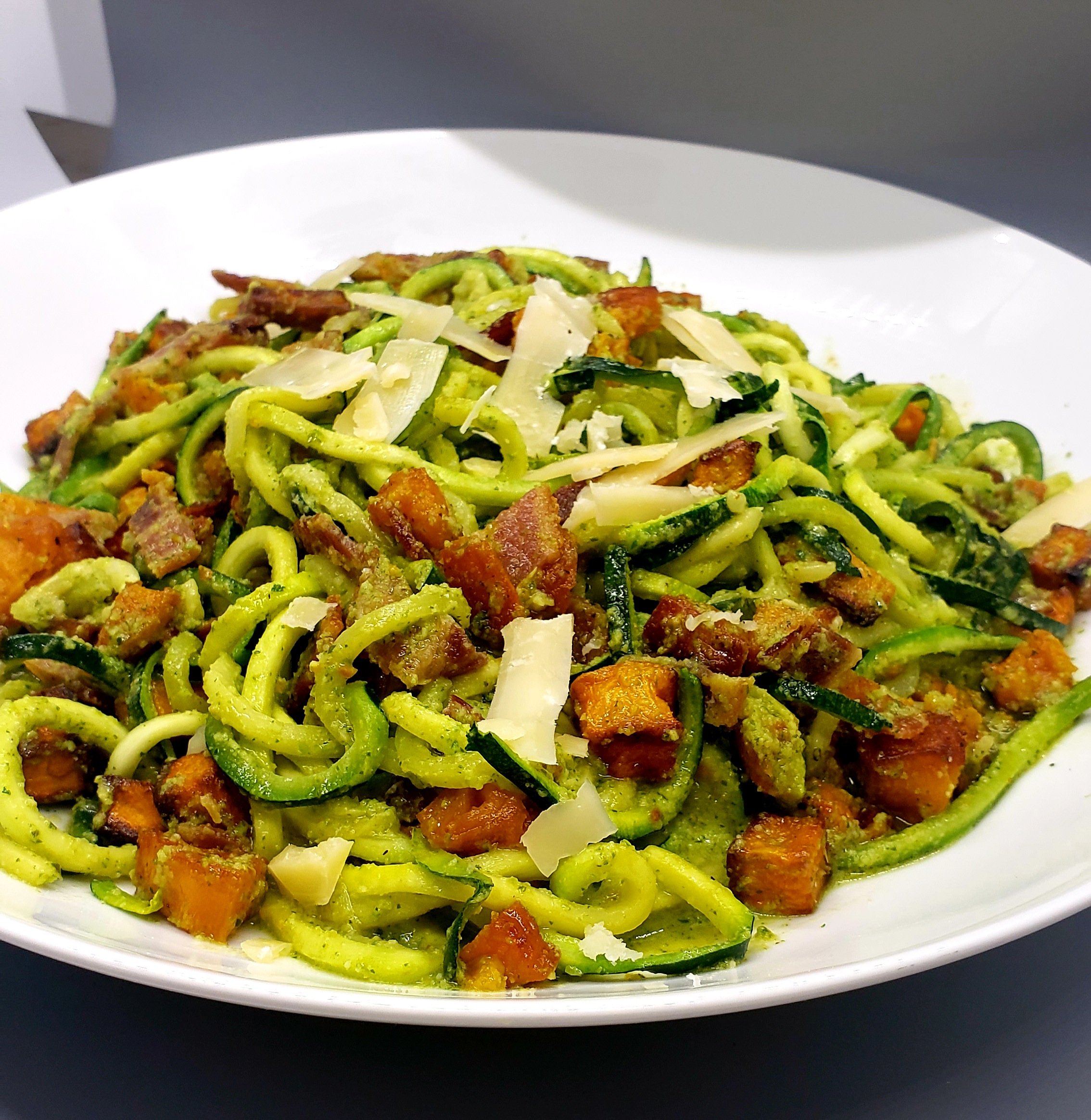 Place the bacon skillet back on medium heat. Add 1 Tbls olive oil to the bacon fat and heat over medium heat. When up to temp, add the zucchini noodles and sauté for 2-3 minutes, while swirling the pan often to move the zuchinni around. Add in the pesto and stir to coat all of the zucchini. Finish by adding in the chopped bacon and roasted sweet potatoes. Top with shaved parmesan cheese.