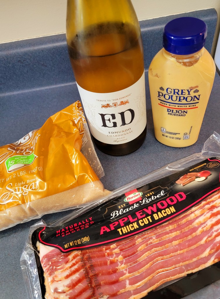 This recipe below calls for white wine, Dijon mustard, brown sugar and 2 pounds of bacon. Our house is not often shy of Chardonnay and that is what I used this week, but any dry white wine that you would drink is great for this. The first time I made this, the recipe called for the same volume of candy coating ingredients, but only 1 pound of bacon. There was a lot of coating left over and that feels wasteful. I have modified to adjust the volume of candy coating goodness to suit 2 pounds of bacon. You could also halve the recipe if you just want to make 1 pound…but who only wants one pound of bacon?!