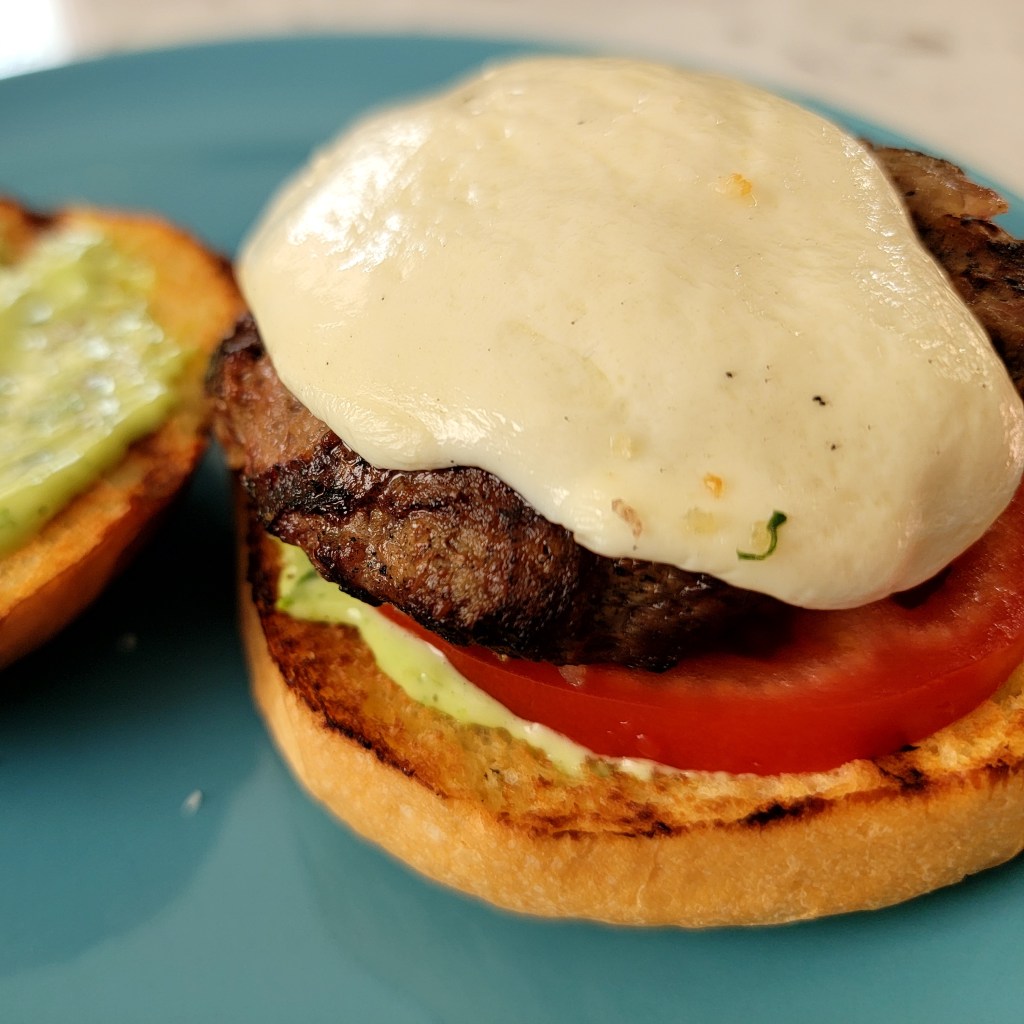 We appreciate the flavor of lamb and have enjoyed making ground lamb burgers for years. It is a leaner alternative to the standard beef burger and doesn’t leave me feeling so stuffed when I’m done eating it. There is also a gaminess to the lamb that pairs well with strong flavors – like bright tomato, mozzarella and a fresh/bold aioli from the basil/garlic combo, respectively; or with an olive tapenade, tomato and goat cheese (oh wait, that’s a different recipe.). Either way, you can tell that a lamb burger won’t last long in our house.