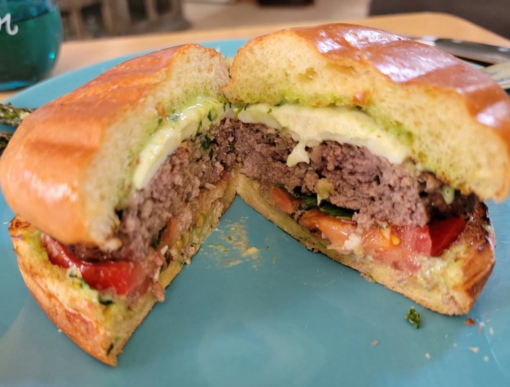 With those cravings, we went on a summer dinner adventure to figure out a creative way to make that combo into a burger. There was a robust discussion on the type of protein (beef, pork, lamb, or chicken – we chose lamb) and whether to double the basil punch (which I did with aioli and more fresh basil). In the end, our goal was to create a yummy burger that we could add to our meal rotation.