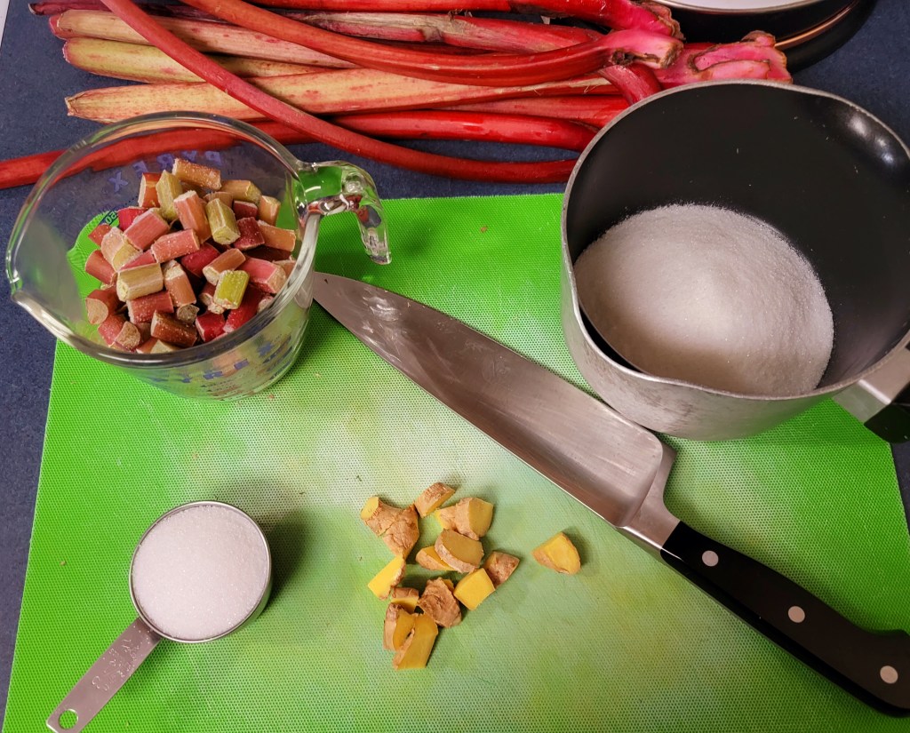 Combine all four ingredients in a sauce pan over med-high heat and bring the mixture to a boil. Once boiling, turn it down to simmer for about 20-30 mins, until the rhubarb is partially dissolved into the syrup.