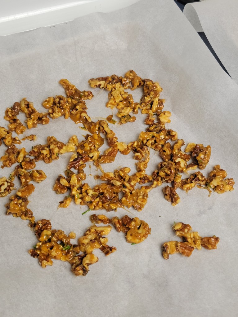 Have the forks at the ready to separate out the syrup wrapped walnuts on the sheet pan. And bring back some more patience to refrain from eating all the nuts right away. They need to cool…and you need them for your other dishes.