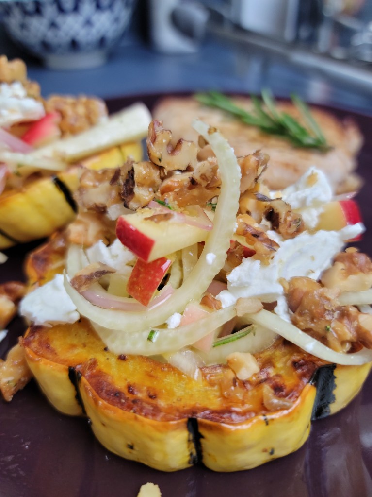 The final dish epitomizes fall with roasted delicata squash, fresh and crispy fall slaw, goat cheese and candied walnuts. Thankfully there were plenty of left over walnuts for snacking – they are so good, they stand aline in their greatness.