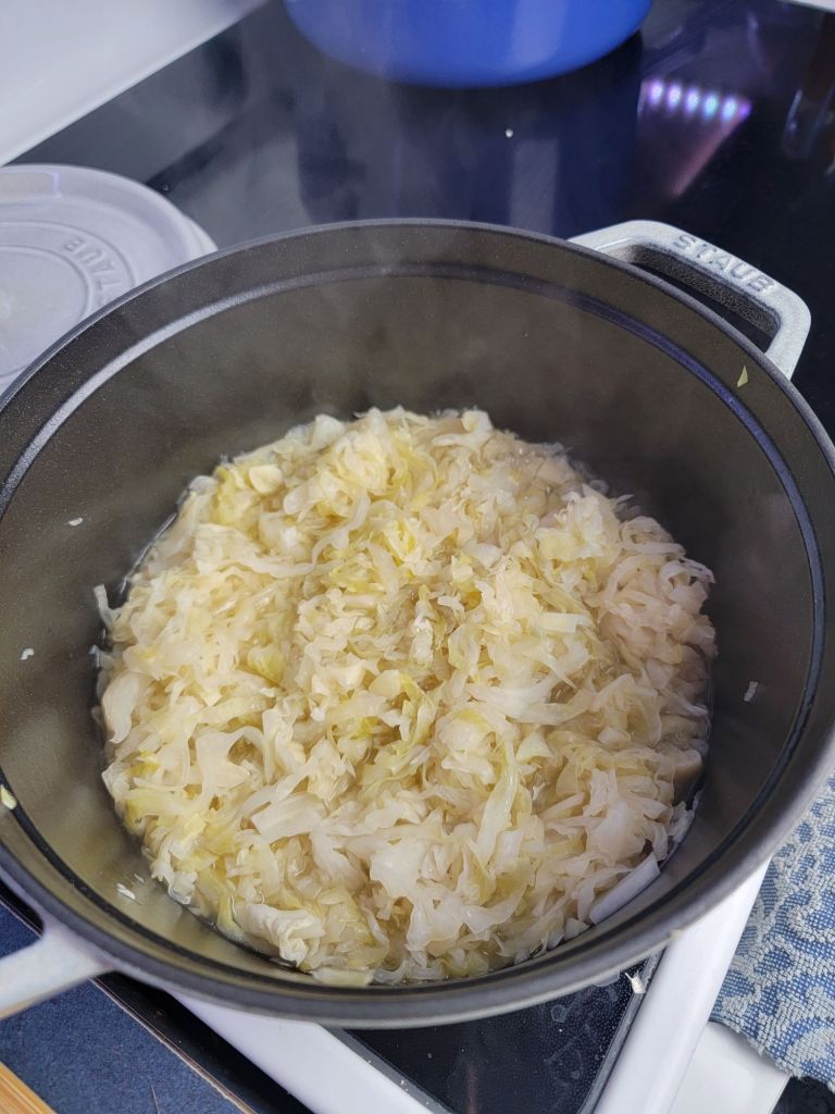 What I want to share about this quick sauerkraut is that it addicting, even while making it. It began with tasting along the way until it hit the desired sour and sweet combo while retaining its texture. It ended with me I continuing to taste more often than needed because it is that good. I believe it is the apple cider vinegar that gives a little sweet to the sour that I wasn’t found of as the kid.