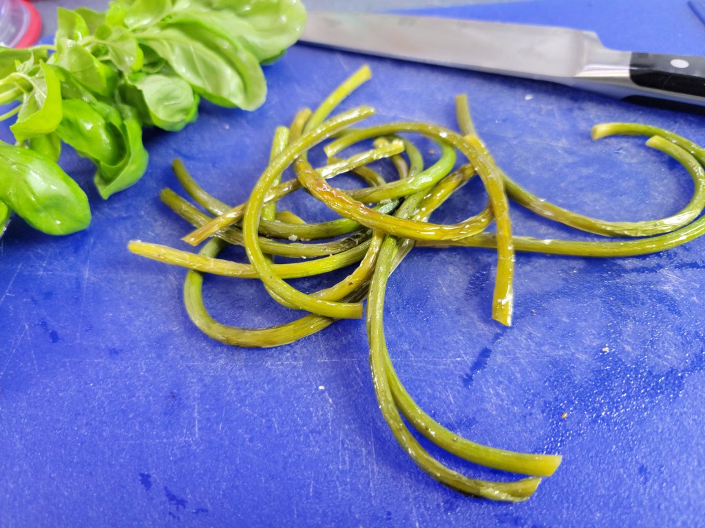 - 10-12 garlic scapes, roughly ends and flower top removed