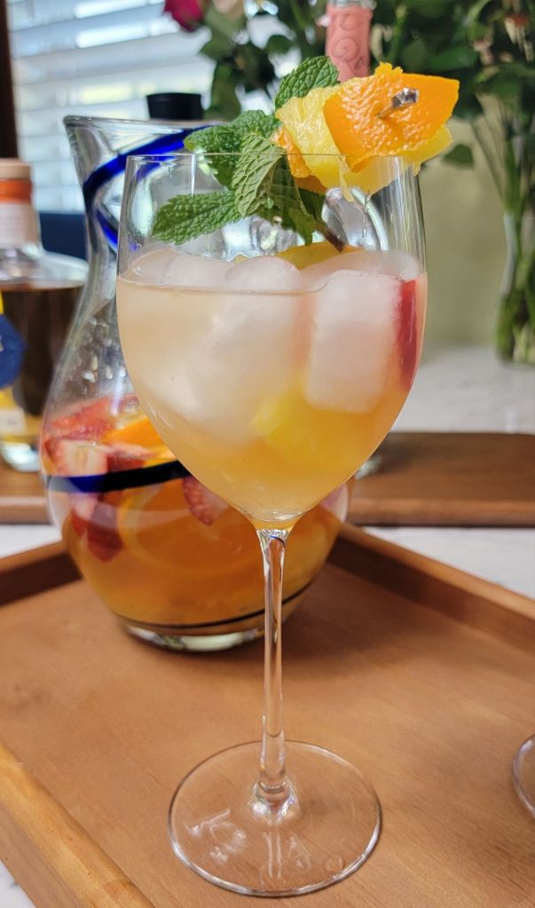 Sangria can be what you make it and to the level you want. I’ve seen (and tried) different sangria recipe. Most call for a bottle of wine, somewhere between 1/2 to 1 cup hard liquor or liquors and complimentary fruit. If you’re not a fan of hard liquor, go for the lower proof liquors and not as much. It really can be your canvas, so it’s all about what you like and having fun putting it together.