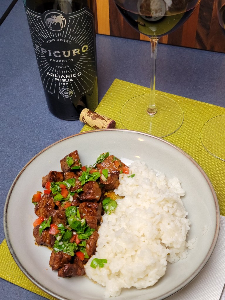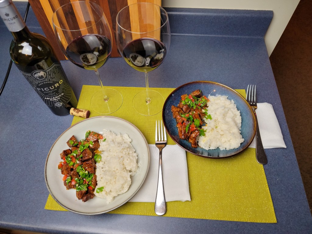 The steak was cubed and marinaded in the dry rub while prepping the chimichurri. The rice was started before heating the pan to cook the steak, and the timing was perfect.