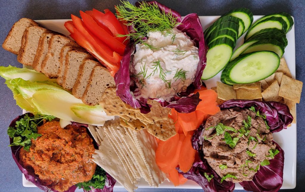 - Serving items: fresh veggies, crackers, warm sliced baguette with feta.