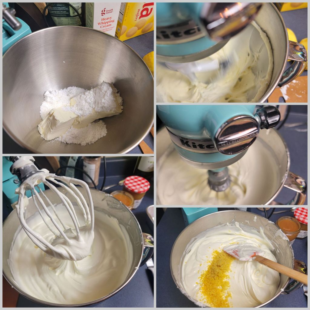 In a stand mixer with the whisk attachment, combine room temperature cream cheese and powdered sugar on medium speed. When combined, add the heavy cream and slowly increase the speed to whisk until thick peaks form. Not quite as thick at meraigne peaks, but firm. Slowly fold in the lemon zest.
