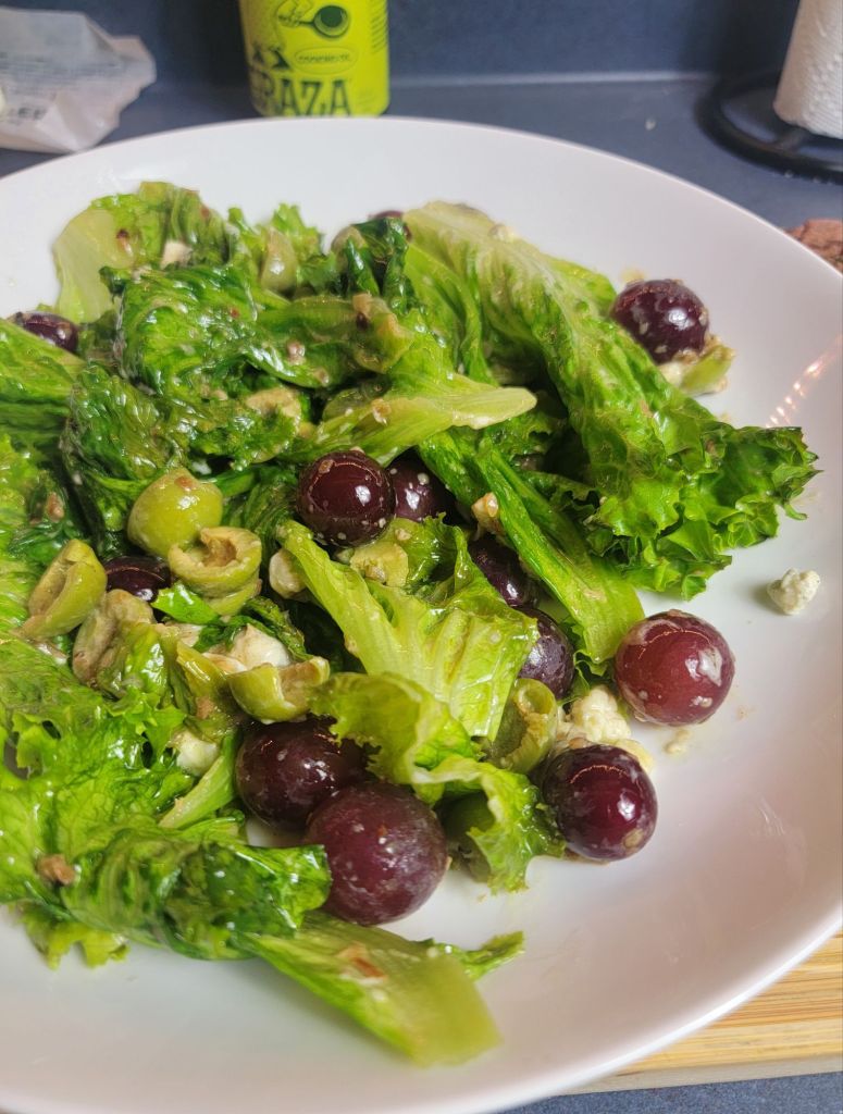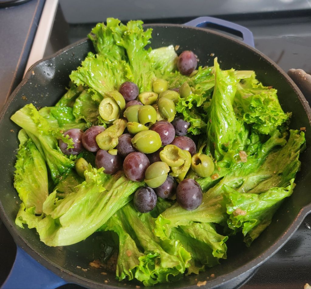 This salad was out of a French cookbook, Á Table, and when the theme was salads and this had olives, grapes, and blue cheese, I knew I wanted to pair thinly sliced steak with this to accompany the star that will be the salad. The recipe calls for Escarole, but we were not able to locate any, so we opted for a hearty green leaf lettuce that would stand up to being warmed without wilting like spinach or chard.